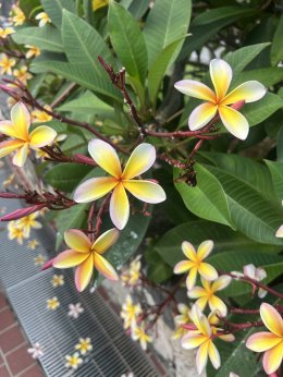 花は6~10月に咲き、一番いいのは6月中旬だそうで、本土では、沖縄が暖かいので年中プルメリアが咲いていると誤解されているとか。