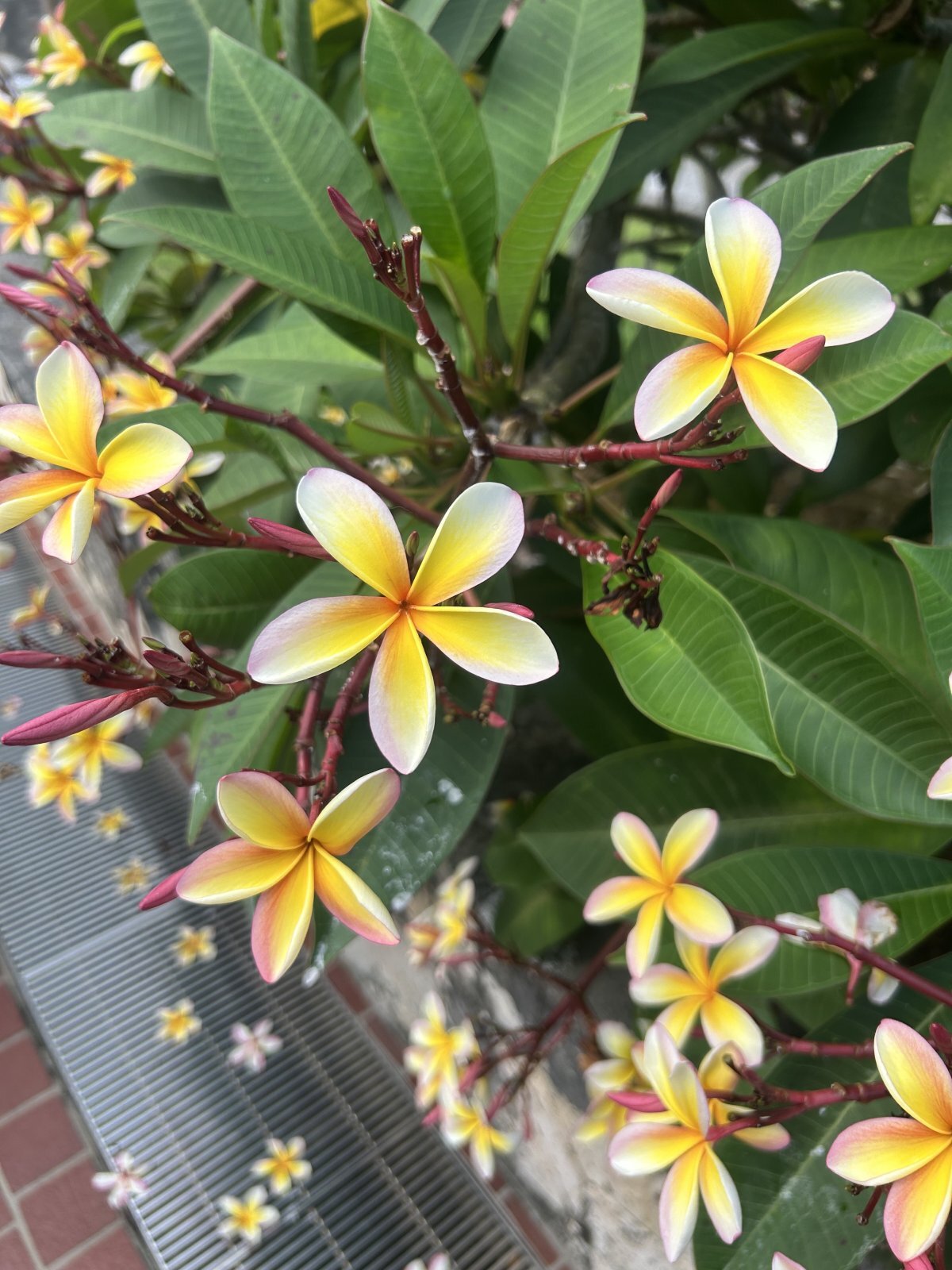 花は6~10月に咲き、一番いいのは6月中旬だそうで、本土では、沖縄が暖かいので年中プルメリアが咲いていると誤解されているとか。